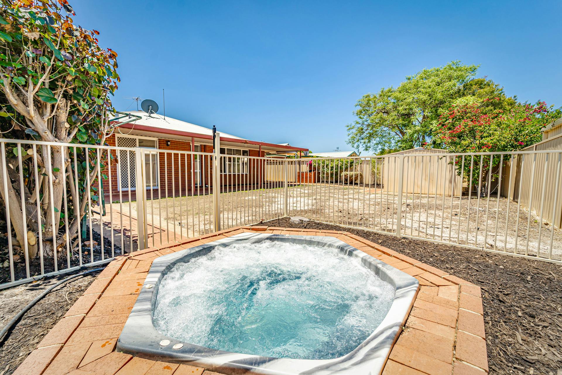 Outside features include a patio entertaining area, relaxing spa, grassed backyard, bore reticulation, storage shed, and double carport with a garage door.